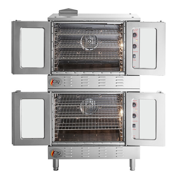 Perfect for virtually all cooking and baking applications, this Cooking Performance Group FGC-200-NK double deck full size natural gas convection oven package is an invaluable asset to any commercial kitchen. Powered by 54,000 BTU per oven, the unit offers 2 full size cavities that each house 3 adjustable wire racks. These racks rest on the 11 sets of slides along the interior side walls, so you can benefit from a variety of rack configurations to best accommodate your trays or full size food pans.